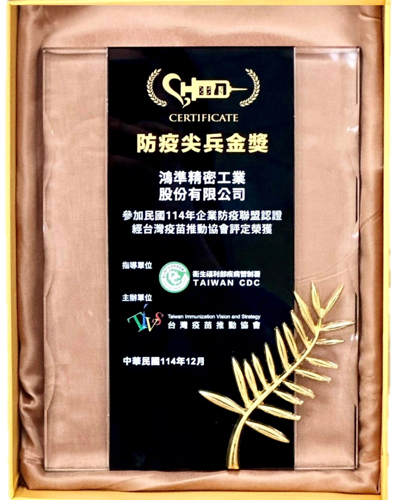 好消息!鴻準榮獲「2025 年防疫尖兵-金獎」肯定,誠摯感謝疾病管制署及台灣疫苗推動協會在疫苗推廣與公共衛生領域的專業支持。 提供充足健康照護資源,及急救設施,守護全體員工身心健康,打造安全舒適的工作環境。